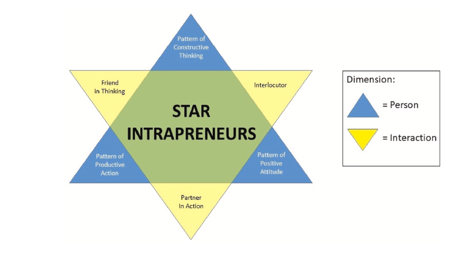 Intrapreneur bintang muncul dari tiga dinamika, yakni internalization, interaction, dan actualization dalam kerangka corporate entrepreneurship. Intrapreneur bintang mempunyai dua dimensi utama:sosok (person) dan interaksi (interaction).
